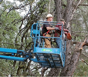 The men in the lift with chainsaws are Wayne Holley and Jerry Pullin I believe, shown in the picture on the SCOPA web site. I am not sure who the ground observer persons identify (No helmet or eye protection worn in a tree felling operation area).