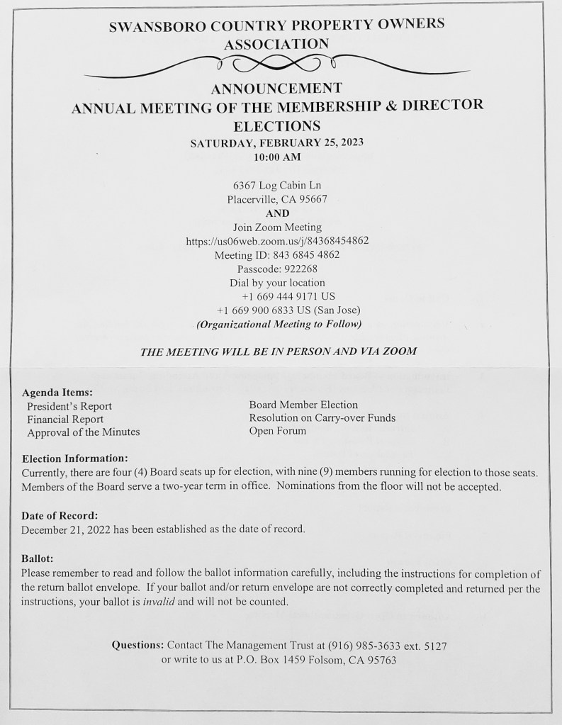 • Why did not all members get the annual member meeting notice for Feb 25th, 2023, in the packet sent to them on or about January 24th? (attached below) – Correction, the member asking this question did find the current annual member meeting notice (Ed).