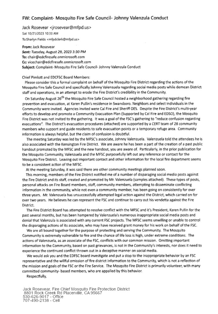 As reported by MFPD board chairman Don Stever, recent social media posts by MFSC associates containing personal attacks and negative comments about Chief Rosevear prompted the MFPD board to file a complaint (original below) with the EDCFSC. Notably, these negative comments are coming from associates of the MFSC, raising concerns about potential efforts to undermine the MFPD’s authority. The question arises whether an unelected county fire safe council, such as the MFSC, can work without oversight to impact the autonomy of a county tax district like the MFPD. This possibility is being explored.