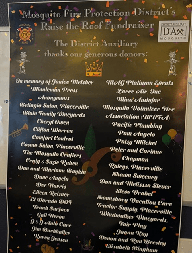 On Saturday, May 10th 2025, MFPD D’Ax held its first major fundraiser event: “The Mosquito Fire Raise the Roof Fundraiser”. Proceeds from this event will pay for a new roof for the Mosquito fire station. The Sentinel was in attendance, along with about seventy donors and supporters of our Mosquito Fire Department. Diane Wilkinson catered this event, and the food was fantastic: tri-tip and chicken, all the trimmings and cheesecake desserts.